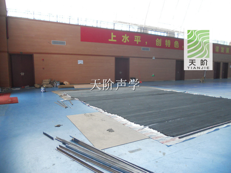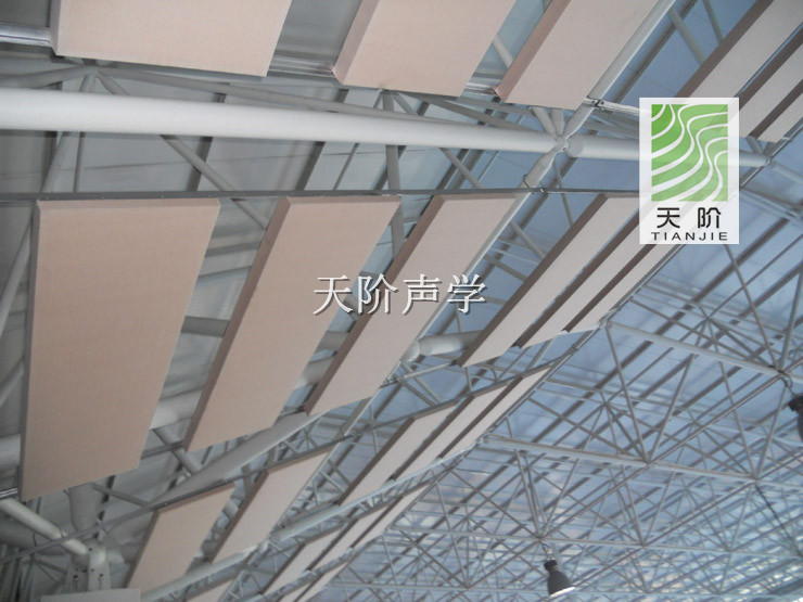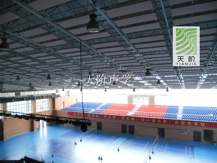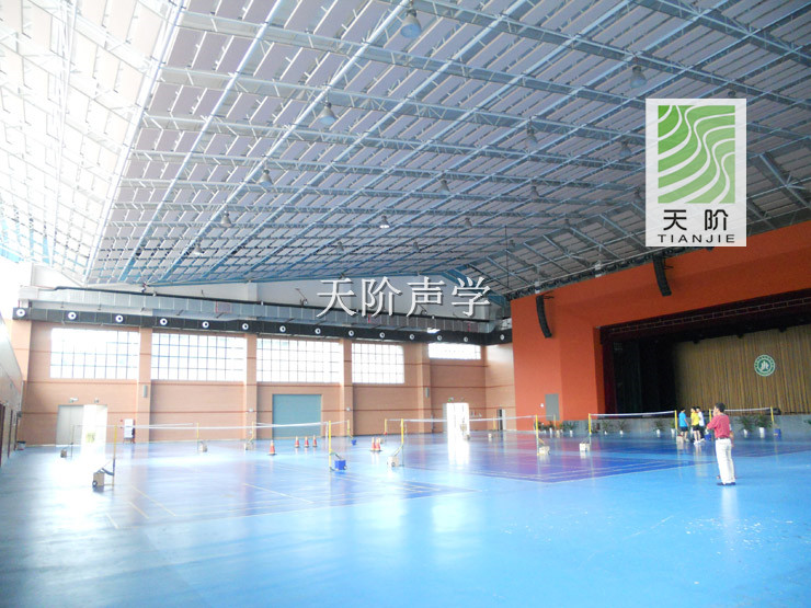 韶關市乳源縣體育館位于乳源縣城北郊,旁邊有乳源高級中學,面臨京珠高速公路。此工程今日正式完工,它使用了多種天階牌吸音材料,由于體育館容積大,自由聲程過大,容易產生回聲和多重回聲。使人聽音渾濁,干擾音響設備的正常運行。在體育館的墻面安裝了槽木吸音板聚酯纖維吸音板等聲學材料。     同時體育館頂棚也裝有具高效天階平板吸收性能的空間吸聲體。天階平板空間吸聲體是由優質玻璃纖維棉、定制鋁質邊框、吸音防塵玻纖布組成。它是其他聲學材料吸聲行能的2倍。從而大大減少了體育館的回聲