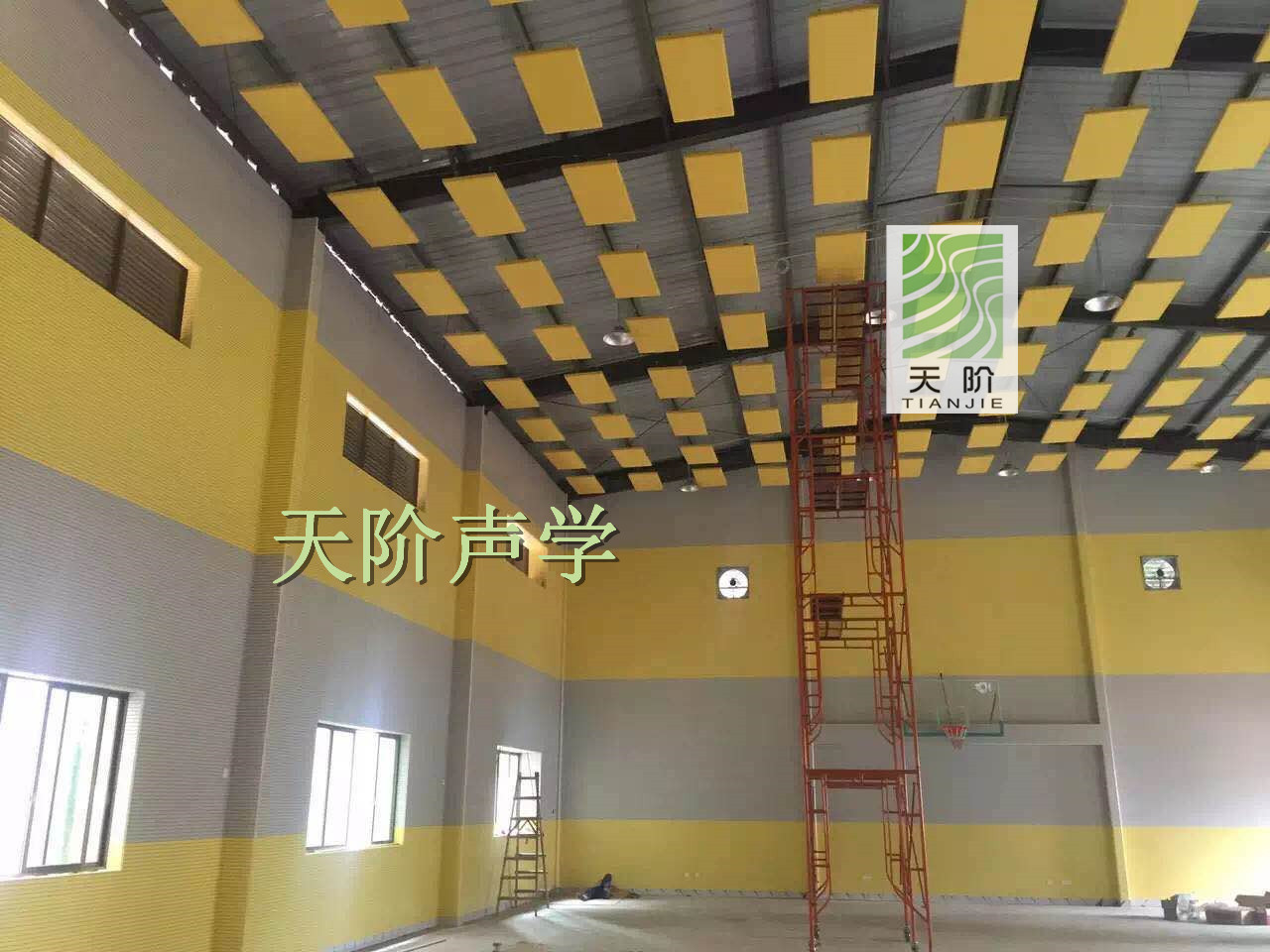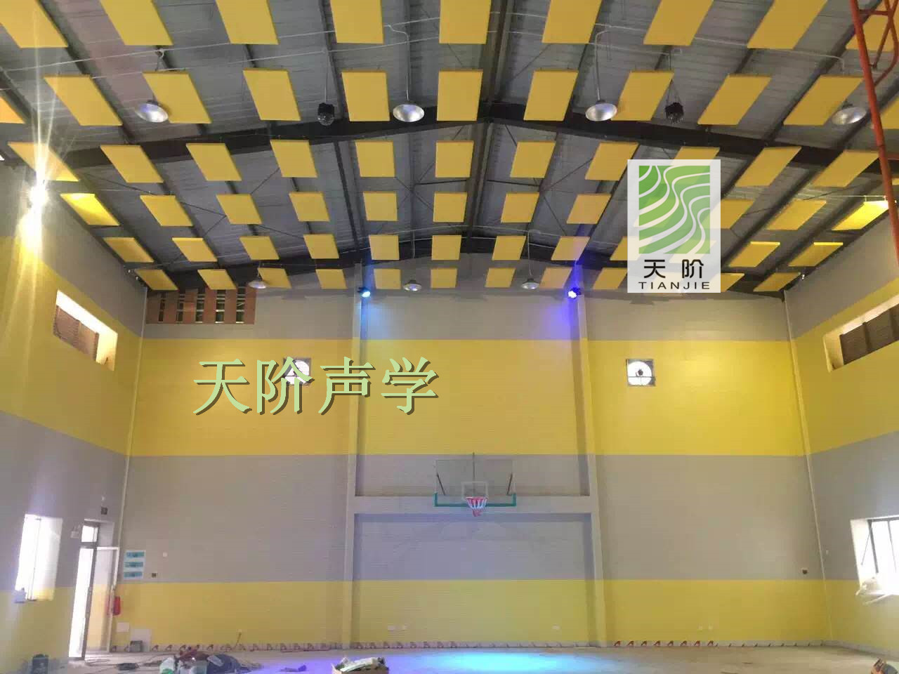 常德南源實驗學校需要建一所室內體育館。學校特地邀請了專業的聲學設計師進行設計,選用了平板空間吸聲體。空間吸聲體是一種懸掛在頂棚具有高效吸收性能的吸聲材料。空間吸聲體一般水平或者垂直吊掛。