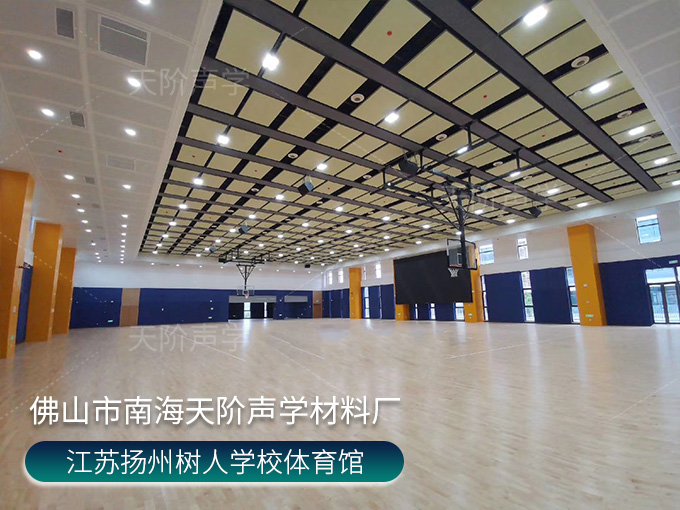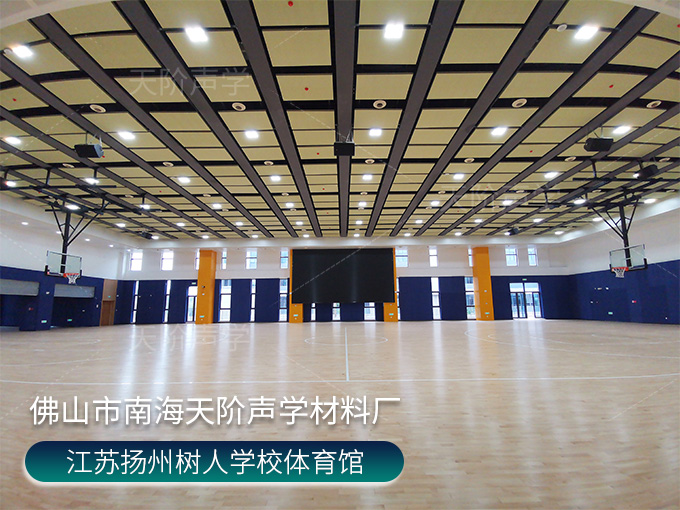 江蘇揚州樹人學(xué)校體育館項目,使用平板吊頂空間吸聲體用頂部吸音裝飾;墻面選用白色+深藍(lán)色色調(diào)飾面的槽木吸音板,基材選用不燃的玻鎂基材,裝飾設(shè)計美觀,有出色的降噪效果。