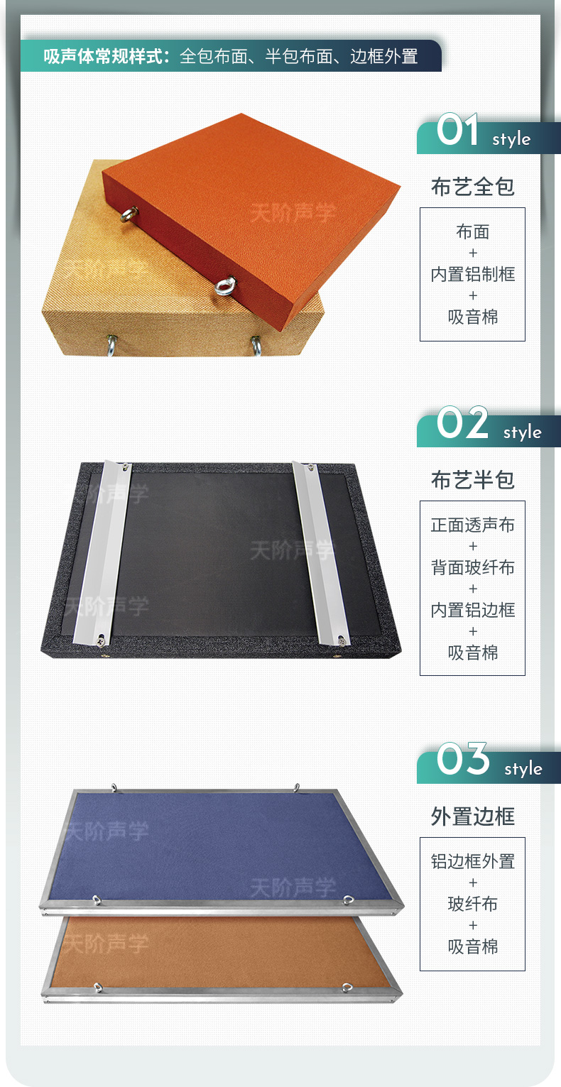 常見的空間吸聲體由骨架、護(hù)面層和吸聲填料構(gòu)成。材料的選擇應(yīng)視空間吸聲體的大小、剛度和裝修要求而定。骨架可采用木材、角鋼、薄壁型鋼等。護(hù)面層可采用塑料窗紗、塑