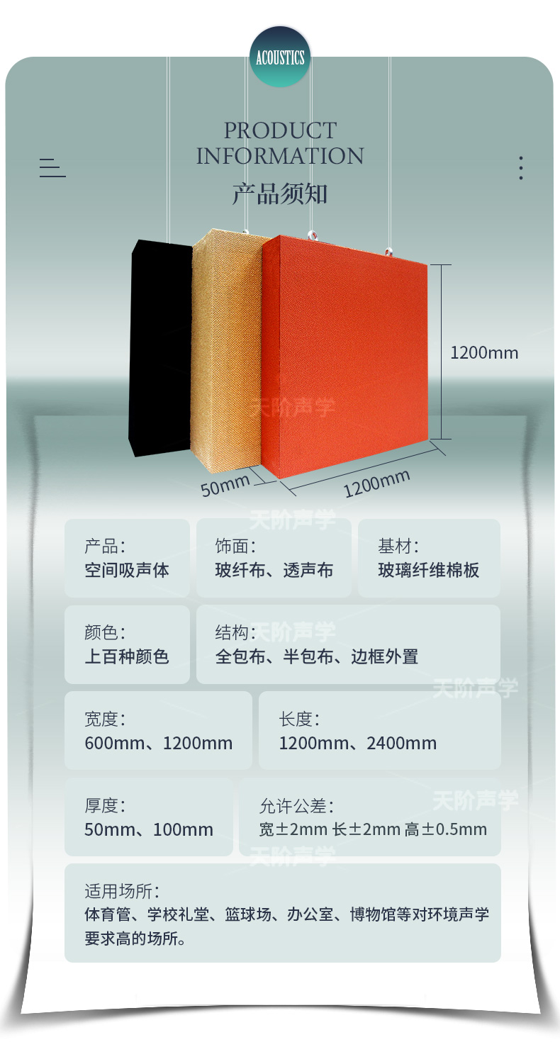一種分散懸掛于建筑空間上部,用以降低室內(nèi)噪聲或改善室內(nèi)音質(zhì)的吸聲構(gòu)件。空間吸聲體具有用料少、重量輕、投資省、吸聲效率高、布置靈活、施工方便的特點(diǎn)。許多國(guó)家從