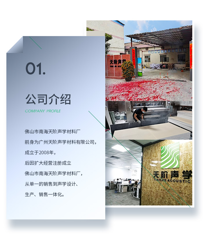 佛山市南海天階聲學材料廠前身為廣州天階聲學材料有限公司,成立于2008年,后因擴大經營注冊成立佛山市南海天階聲學材料廠,工廠占地3000多平米,從單一的生產銷售到:聲學設計-生產-銷售-聲學工程施工一體化,是一家專業的聲學環境解決方案綜合服務商。