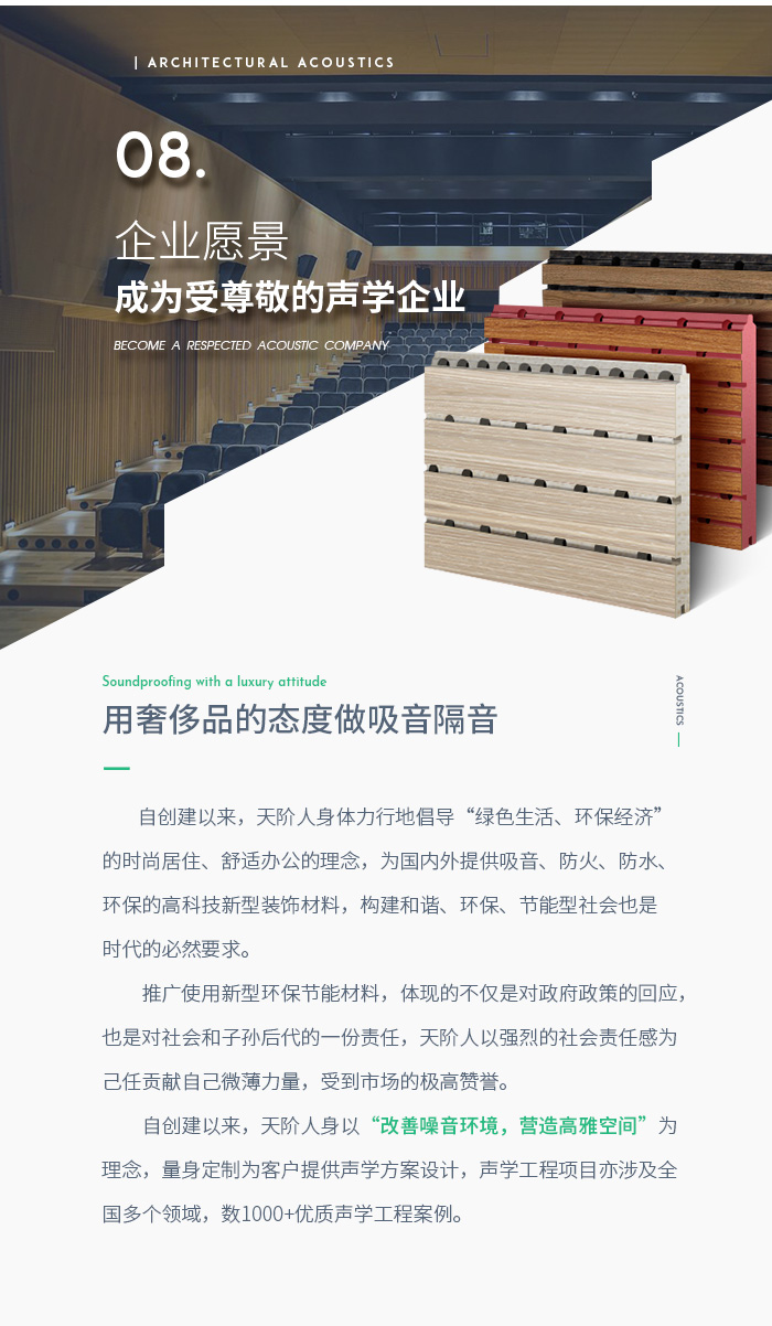 天階在聲學材料領域不斷提高自身的產品品質和服務水平,使公司產品長期得到了國內諸多大學的聲學教授、國家大型建工集團、國內眾多知名裝飾設計公司的大力推廣。我們在今后發展的道路上,將更加狠抓產品品質,信守合作承諾,與廣大新老客商攜手共進共贏。