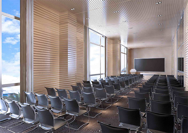 2、會議大廳,大廳的頂部吸聲控制混響時間達到設計值時,通常不進行聲學處理。作為反射面。會議室的聲學結構的配置和選擇,根據它的體積標準(即裝飾的要求),并決定:在100m3左右的小型會議室(一般圓桌會議),如果室內擺放的地毯窗簾沙發平時做不需要再作聲學處理,吸音材料能夠達到預期的混響時間值。在200m3以上的會議廳,一般應設置吸音材料或結構。