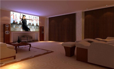 一般建議采用簡潔處理,在處理好吊頂骨架的強度的情況下,特別是處理好音箱吊掛位的強度,并要作好記號,頂部采用石膏板,四周采用石膏成型模塊,周遍采用輕巧的木制幾何結構襯底就可以了。這樣可以配合暗藏的三基色彩燈,相成光折射組合。