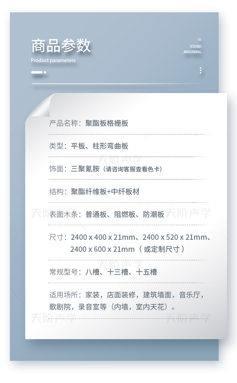 適用于多種場所:多種飾面,滿足不同風格家裝,店面裝修,辦公室,建筑墻面,廣告牌制作,音樂廳,歌劇院,錄音室等(內外墻,室內天花)。